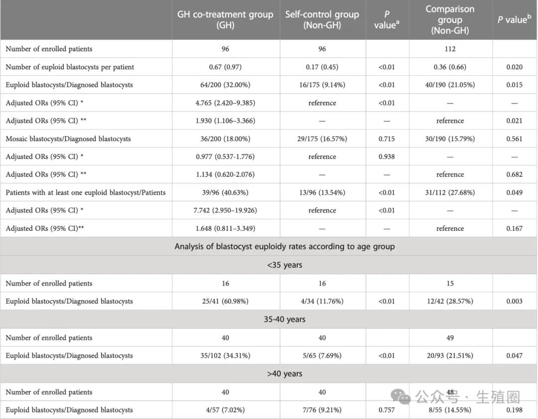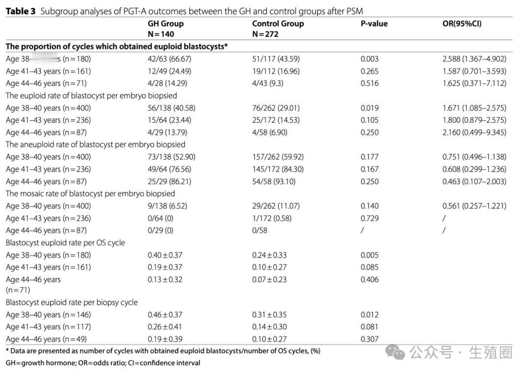 对于38-40岁的女性来说,获得整倍体胚胎的周期比例生长激素组和对照组相比为66.7%vs43.59%;