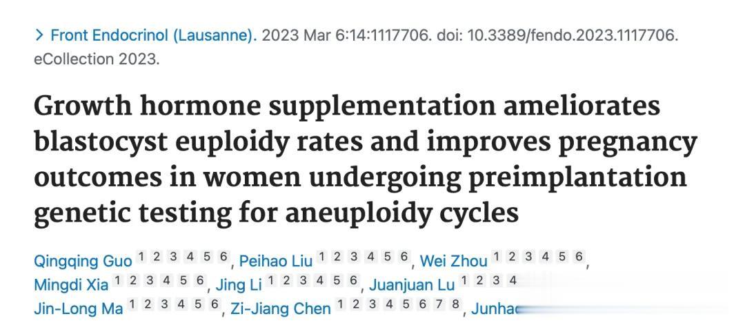 Growth hormone supplementation ameliorates blastocyst euploidy rates and improves pregnancy outcomes in women undergoing preimplantation genetic testing for aneuploidy cycles. Front Endocrinol (Lausanne). 2023 Mar 6;14:1117706. doi: 10.3389/fendo.2023.1117706.