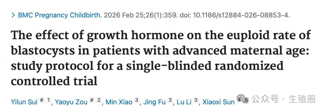 The effect of growth hormone on the euploid rate of blastocysts in patients with advanced maternal age: study protocol for a single-blinded randomized controlled trial. BMC Pregnancy Childbirth. 2026 Feb 25;26(1):359. doi: 10.1186/s12884-026-08853-4.