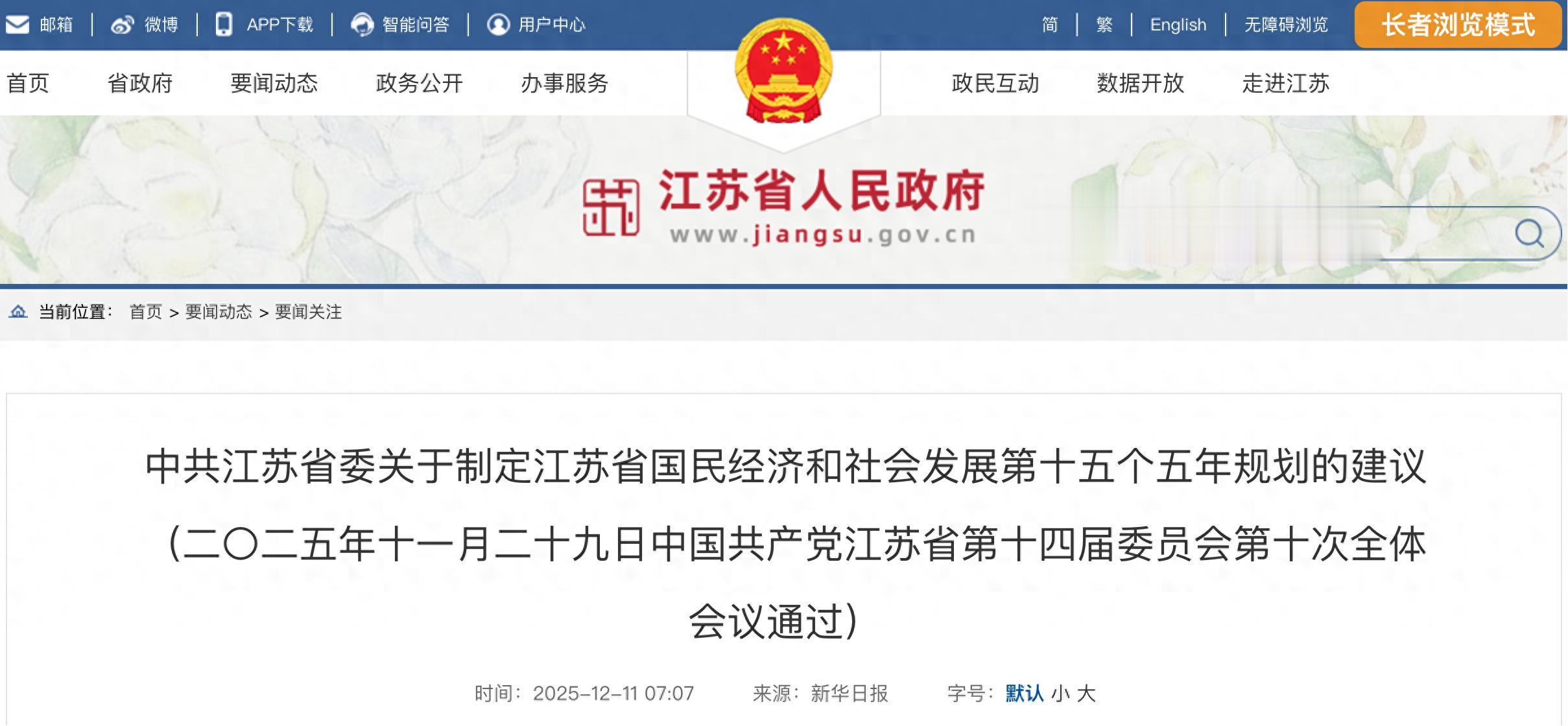 日前,中共江苏省委关于制定江苏省国民经济和社会发展第十五个五年规划的建议发布。