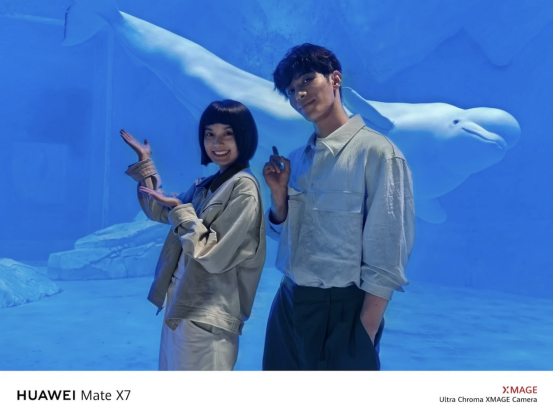 从官方释放的影像视频和实拍样张来看,在水族馆高饱和蓝色灯光场景中,传统拍摄往往会出现色彩溢出、细节丢失的问题,而华为Mate X7的实拍样张却能精准压制过艳光线,让情侣的衣物色彩保持自然通透,同时保留水中光影的层次感。这背后大概率是第二代红枫影像优化了色彩平衡算法,通过AI智能识别高饱和场景,精准调整色域范围与饱和度阈值,避免色彩“跑偏”的同时还原场景氛围感。
