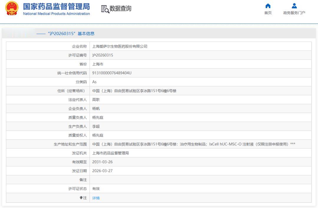 上海药监局正式核发今年全国首张干细胞《药品生产许可证》,上海爱萨尔生物医药股份有限公司成为新年首位获证企业,许可证编号为沪20260315。这一里程碑事件标志着中国干细胞产业在国务院 818 条例即将实施之际,药品监管路径的规范化与产业化进程进一步加速,为细胞治疗商业化落地注入新动力。