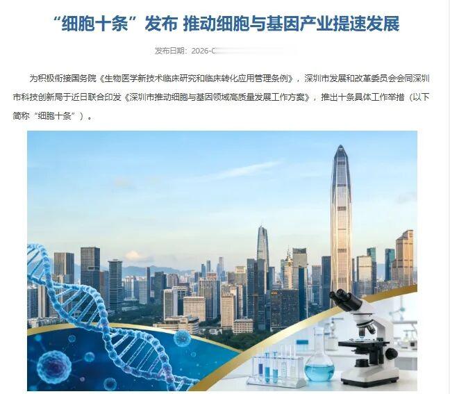 深圳市正式印发《深圳市推动细胞与基因领域高质量发展工作方案》(“细胞十条”),提出十条具体举措。该方案旨在衔接即将于2026年5月正式施行的国务院《生物医学新技术临床研究和临床转化应用管理条例》(下称国家条例),并设定了明确的发展目标:到2028年,全市细胞与基因治疗产业规模达到200亿元,IIT(研究者发起的临床研究)项目达到50项,建成2个以上CRO/CDMO服务平台,服务企业超300家,致力于打造该领域的技术、企业和人才集聚高地。(下图来源:深圳市发改委官网)