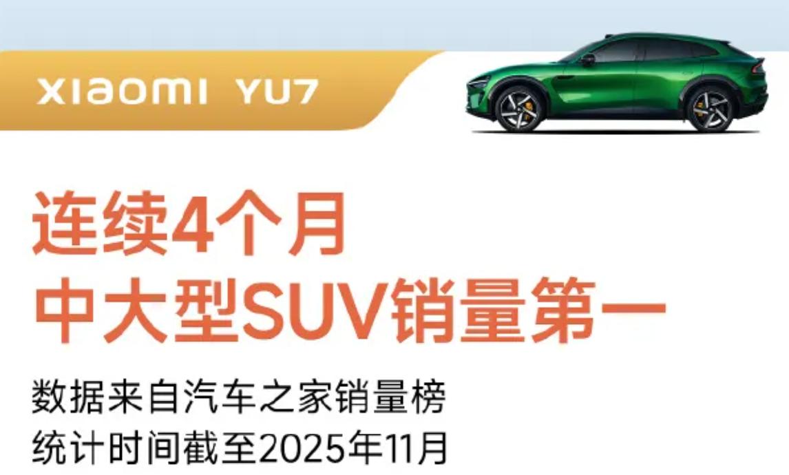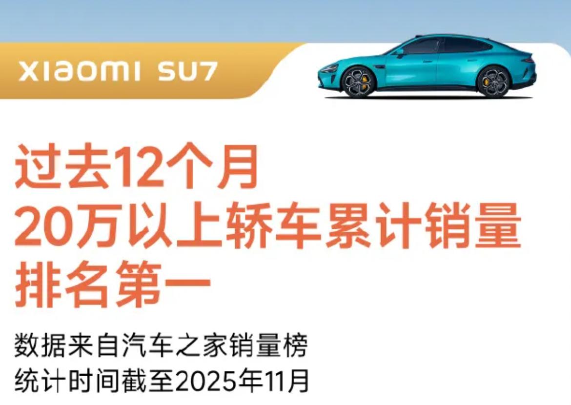 其中SU7是过去12个月,20万以上轿车中的销量第一名(截止2025年11月,汽车之家数据),这个20万以上的价格中,不分油车、电车,混动、增程等,就是所有20万以上价格中的第一名。
