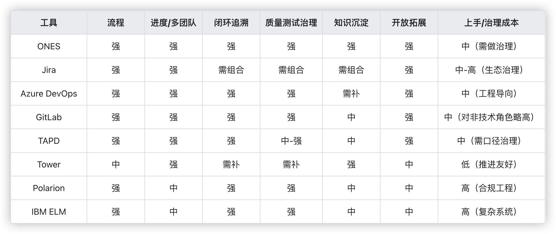 它在“推进与协作”上很顺,但在“端到端闭环(需求—代码—测试—发布)”与“质量测试治理”方面通常需要外部工具链支撑——这不是缺点,而是定位决定的边界:推进层很强,不一定做治理底座。