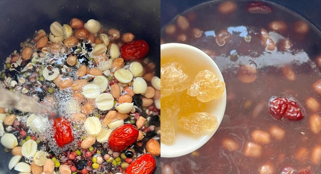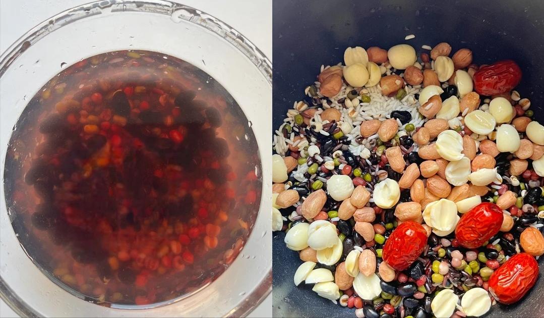 食材:黑豆、红豆、黑米、莲子、花生、薏米、绿豆、糯米,每种都来 20 克,再准备 4 颗红枣