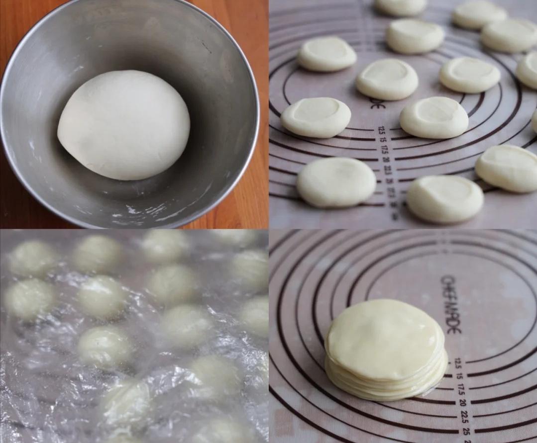 3、再把每个小剂子擀薄一些,跟饺子皮大小差不多就可以,然后把每个皮刷一层油,再重复盖一层,一次大概5-6张就可以;