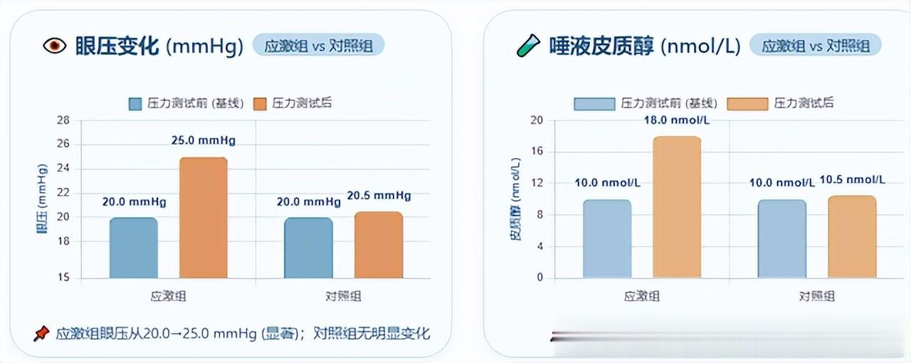 比如,2024年发表在《眼科与青光眼》杂志的一项随机对照试验《心理应激与青光眼患者眼压变化》也从数据上证明了压力对眼压的影响。研究中有39名原发性开角型青光眼患者被分为“应激组”和“对照组”,在经过标准化心理压力测试后,应激组受试者的唾液皮质醇水平显著升高,同时眼压在压力刺激后有明显上升趋势,而对照组变化不明显。