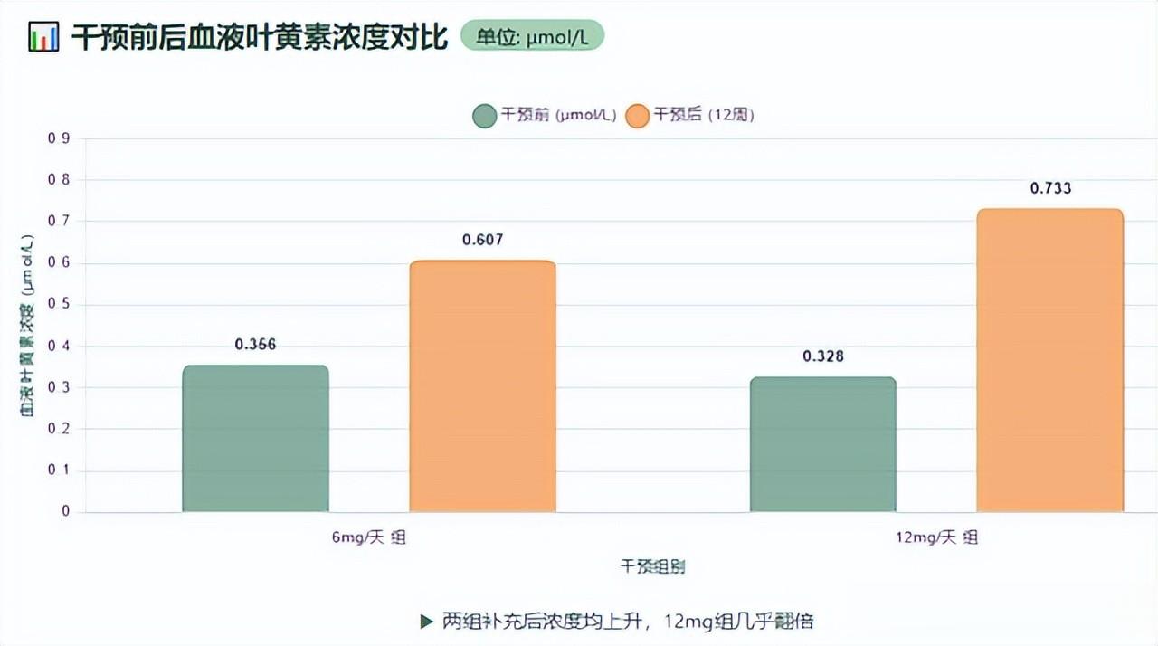 结果显示,补充组血液中叶黄素浓度明显升高,6mg组从0.356 μmol/L升到0.607 μmol/L,12mg组从0.328 μmol/L升至0.733 μmol/L,几乎翻倍,说明人体可以有效吸收并输送叶黄素到眼部。