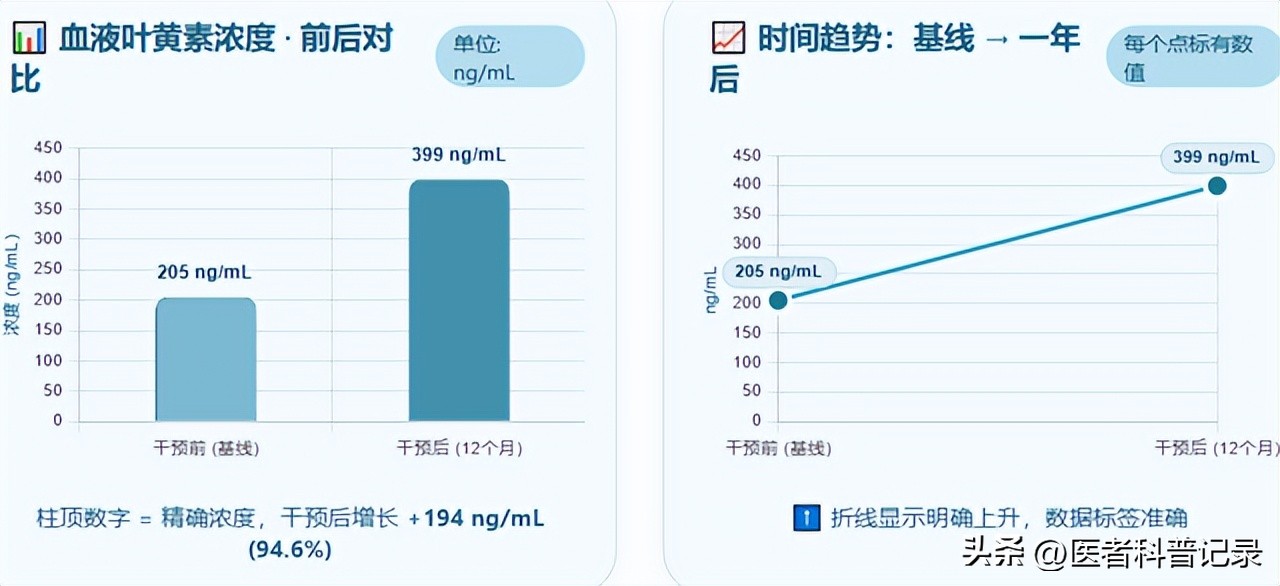 还有一项发表在《眼科杂志》的随机对照试验对老年人群进行了长达一年的干预,结果显示每天摄入富含叶黄素蛋黄的饮品后,受试者的血液叶黄素浓度从205 ng/mL增长到399 ng/mL,同时黄斑色素密度和视力测试结果也都有显著改善,这说明日常膳食中适量摄入蛋黄类富含类胡萝卜素的食物,确实可以在体内提升这些关键营养素水平,对视觉质量有实际帮助。