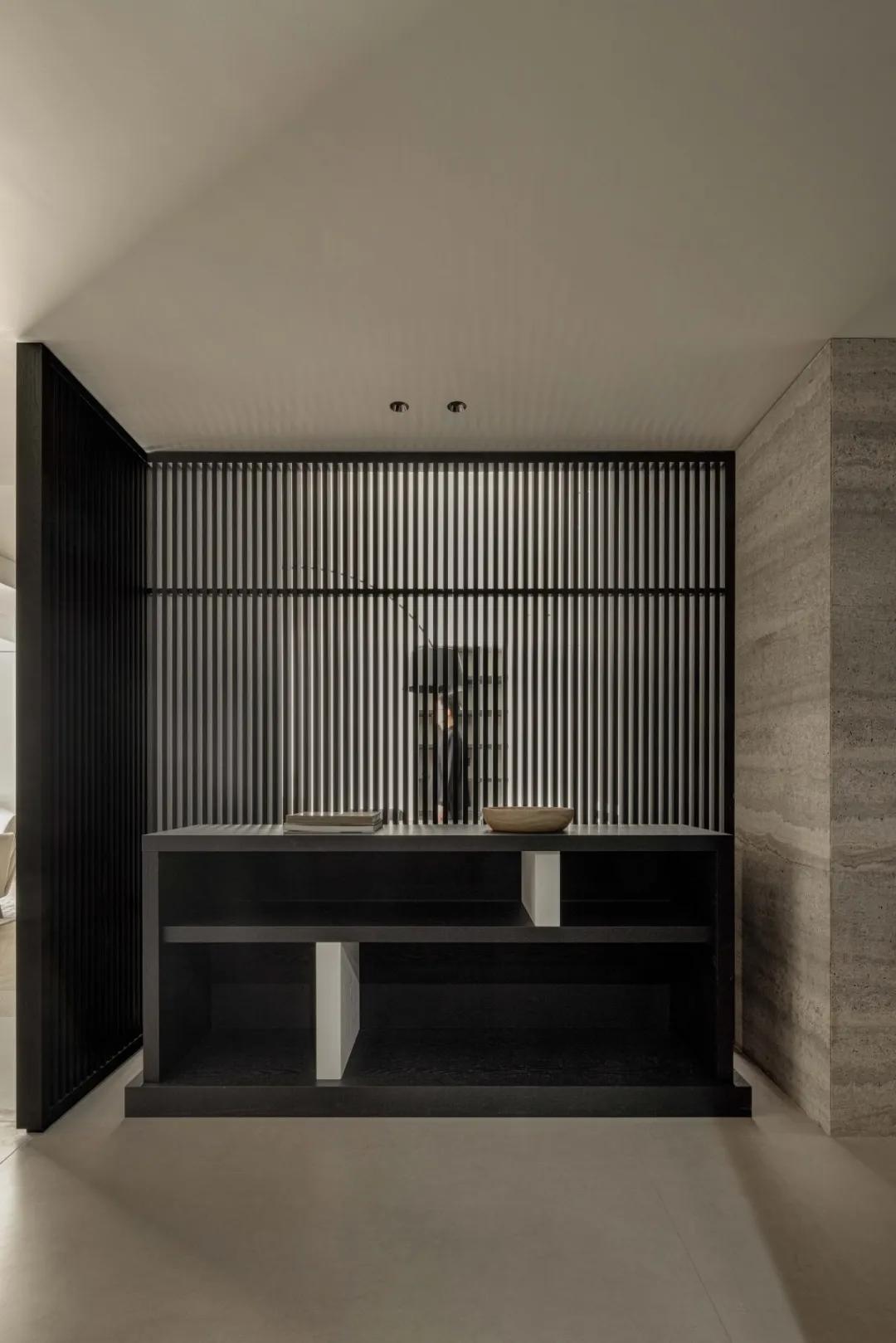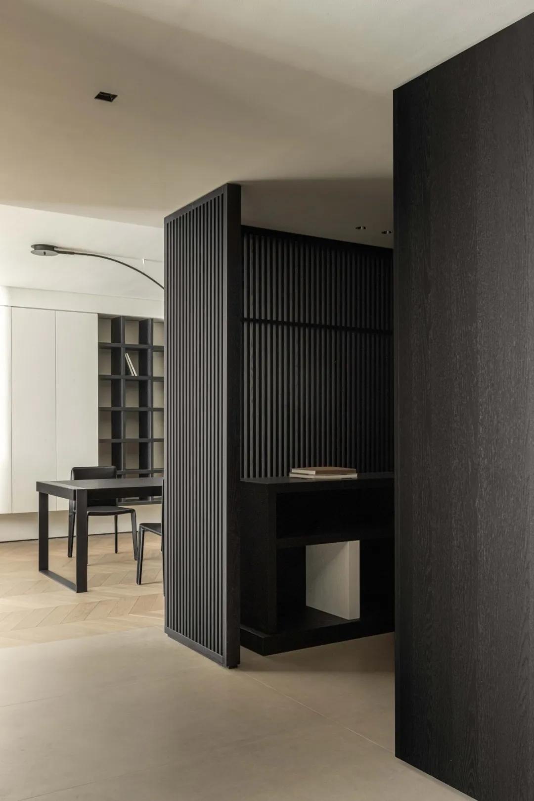 黑橡木格栅屏风如影影绰绰的间隔符,是进入空间的第一视角,虚实之间,光影流转,层层递进,以光线漫射建立新的内外联系,带来丰沛的情感沉淀。玄关的动人,有治愈抚慰的率真沉稳,亦有曲径通幽的婉转,最终引向境转心生的归属意向。