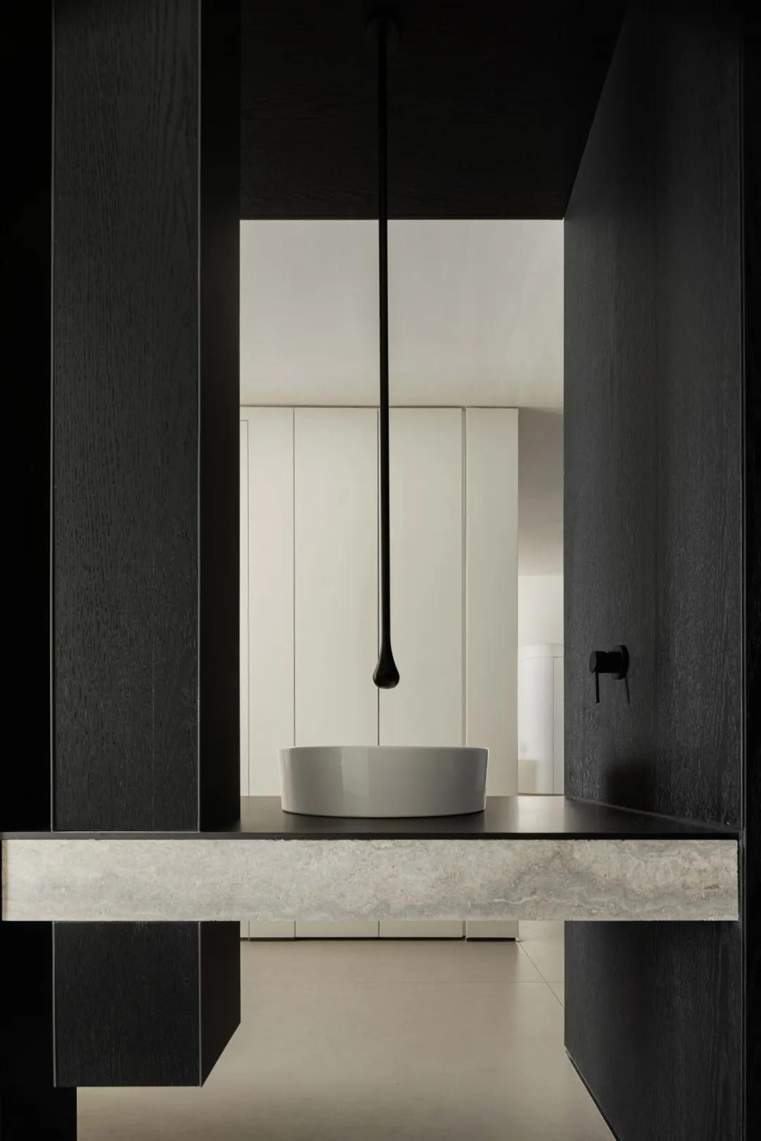 悬挂式水滴龙头如水般丝滑,倾垂而下,于静谧中撩动动态的情绪涟漪,黑白定格,框景如画,此境的功用与艺术融为一体,不动声色间,低调的优雅浑然天成。