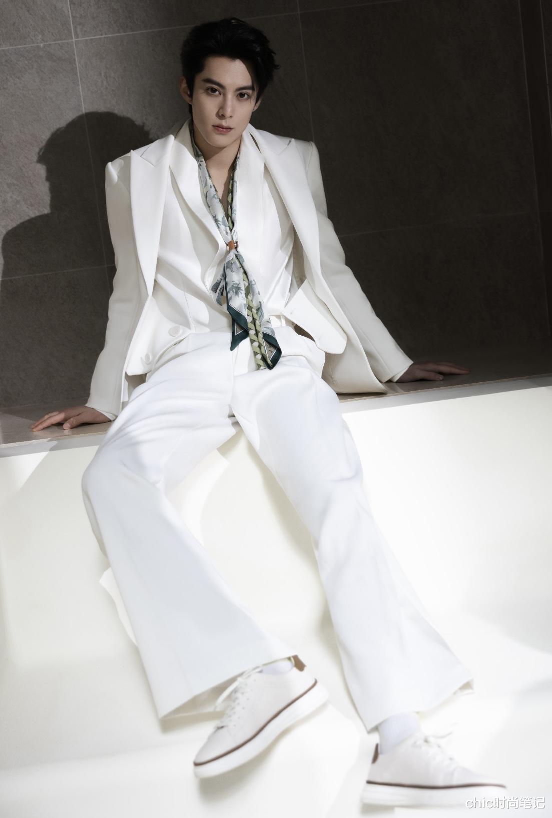 白衬衫+白西服套装+小白鞋的组合干净、清新,西服要选择高质感、坠垂感好的,会让穿搭很有气场与气质,再点缀上一条花色丝巾,有一种“花花公子”的雅痞感。