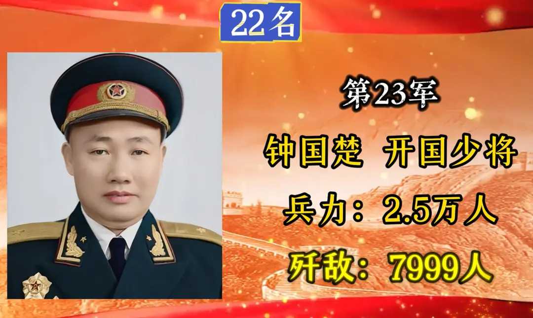 第23军,军长钟国楚,入朝总兵力2.5万人,歼敌7999人。