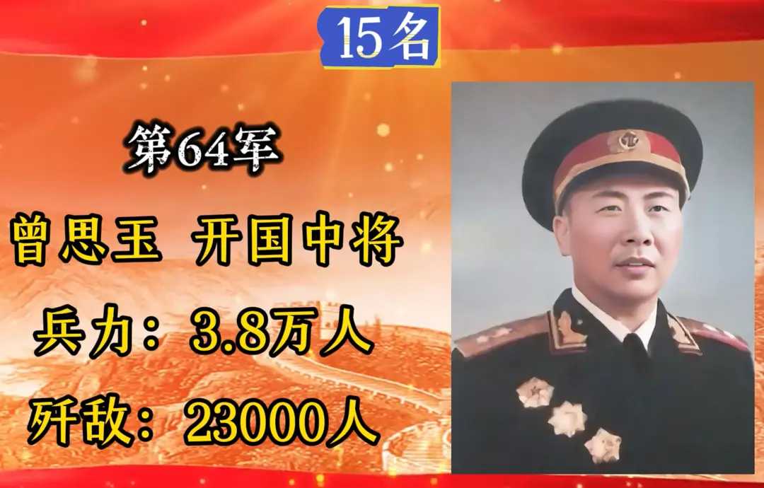 第64军,军长曾思玉,入朝总兵力3.8万人,歼敌23000人。