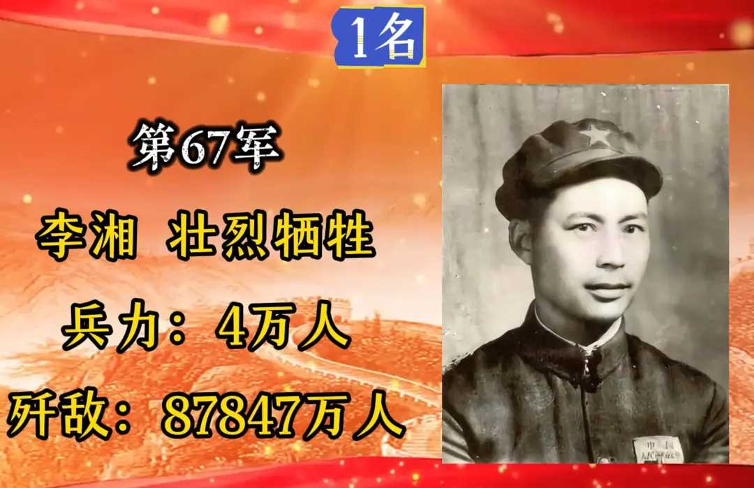第67军,军长李湘,入朝总兵力4万人,歼敌87847人。