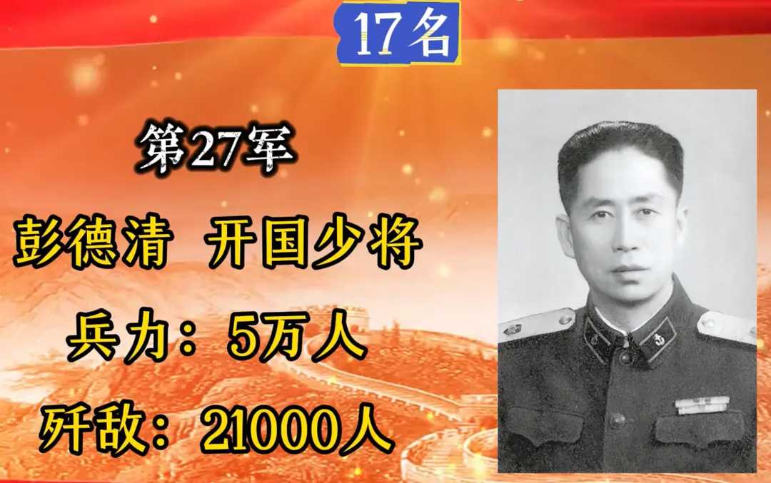 第27军,军长彭德清,入朝总兵力5万人,歼敌21000余人。