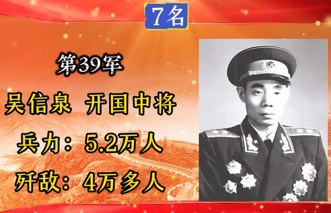 第39军,军长吴信泉,入朝总兵力5.2万人,歼敌40000余人。