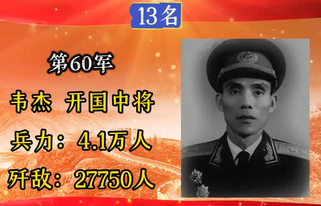 第60军,军长韦杰,入朝总兵力4.1万人,歼敌27750人。