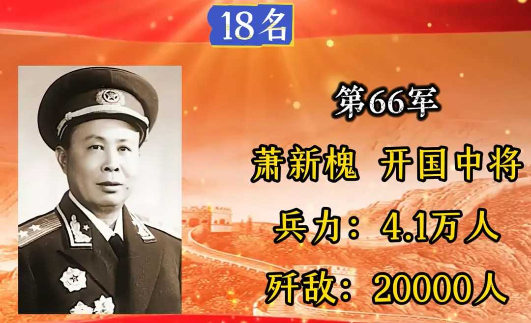 第66军,军长萧新槐,入朝总兵力4.1万人,歼敌20000人。