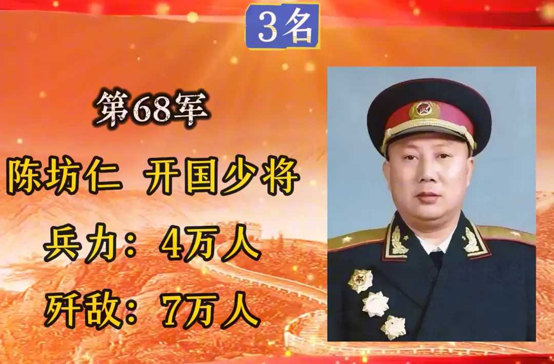 第68军,军长陈坊仁,入朝总兵力4万人,歼敌70000余人。