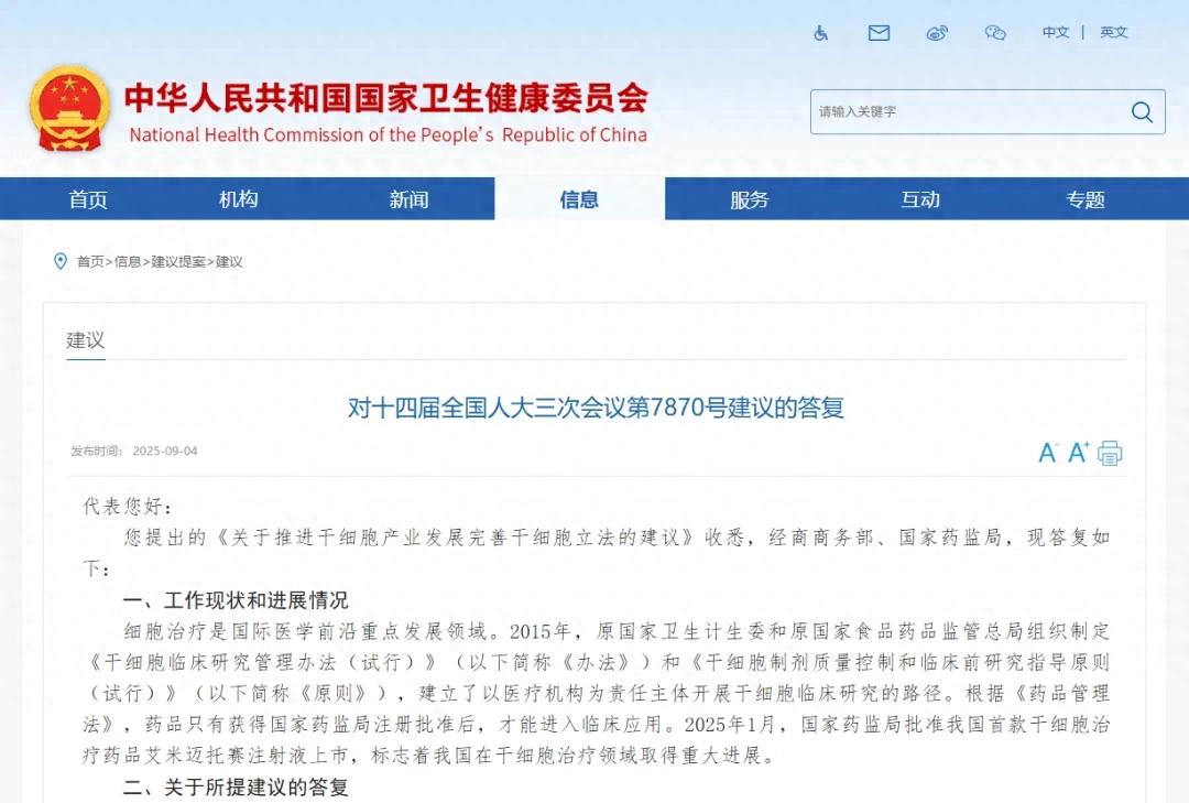1. 卫健委就《关于推进干细胞产业发展、完善干细胞立法的建议》作出答复