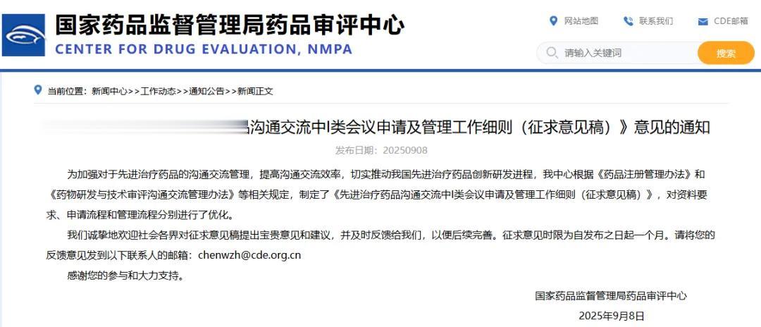 2025年9月8日,国家药品监督管理局药品审评中心(CDE)发布《先进治疗药品(ATMPs)沟通交流中I类会议申请及管理工作细则(征求意见稿)》,拟为三类创新疗法开通快速沟通通道,显著缩短审评时限至30日,加速我国基因治疗、细胞治疗等前沿药品研发进程。(来源:国家药品监督管理局药品审评中心)