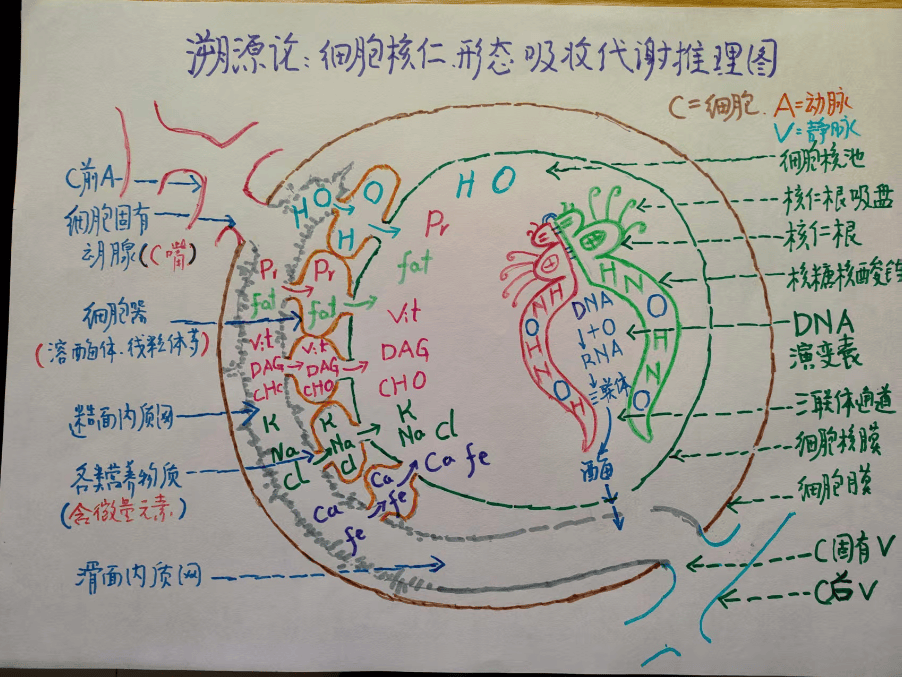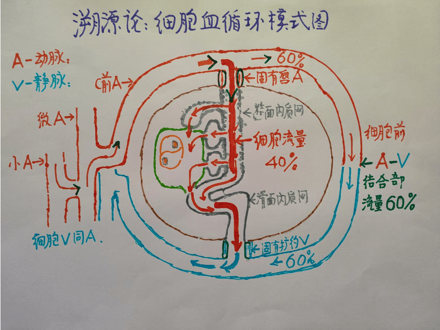 嘴口腔就是细胞糙面内质网的起始端。经过细胞内部结构。,演变成滑面内质网至细胞膜末端[肛肠]。贯穿细胞整体的内质网,与人体胃肠腔消化道同样的形态功能。细胞同瓜果有专一的营养通道嘴[蒂],细胞通过嘴与毛细血管相连。称为细胞固有动脉。上连接于毛细血管。毛细血管的上端是末梢动脉。细胞血液供应的流程是。末梢动脉血[含红白细胞等有形成分]中的血浆流入末梢血管[微动脉,不含红白细胞等有形成分],在经细胞固有动脉[嘴]。进入细胞糙面内质网,贯穿细胞经滑面内质网出口[肛肠]固有蒂[细胞固有静脉]。进入微静脉至小静脉。构成细胞循环[胞循环]。细胞循环。见细胞循环图。细胞循环与人体血液循环有着本质的区别?体循环是心脏,将含有营养成分和代谢产物的动静脉血,经过动静脉对组织器官,进行输送与回收的系统。