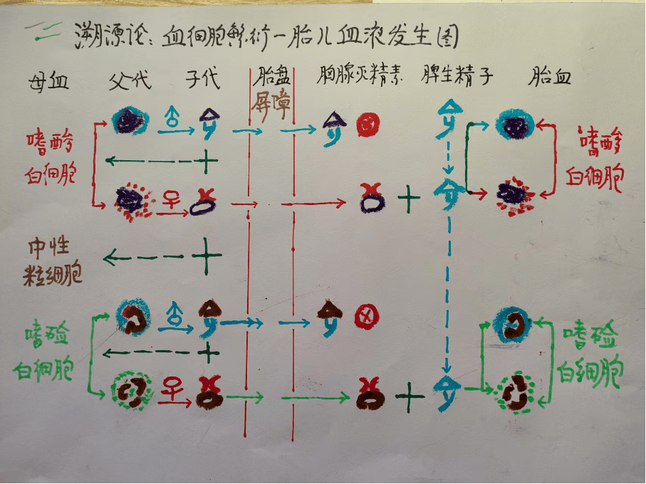 可见。胎儿血液形成是。母体各种血细胞的卵子、精子,夹杂着各种细菌病毒的卵或精子。随血浆,经胎盘屏障进入胎儿体内。与此同时。胎儿的胸腺分泌胸腺素[精子灭活素]。对进入胎儿体内各种血细胞精子。以及各类病毒细菌精子进行灭活。使他们的卵子丧失受精机会。与此同时。胎儿脾脏的脾窦[犹如血液细胞的睾丸生精小管产生精子一样]。产生各种血液细胞精子。与胎儿体内母体血液存活细胞卵结合受精。发育胎儿完整的血液细胞。形成带有父母遗传基因,胎儿独立的血液体系。现代学术上所称的脐带干细胞血。没有免疫[排斥]功能的胎儿血液[成年人体骨髓血细胞,应等同于胎血干细胞功能成分]。这种胎儿血液,再从脐带反流回母体。将引起母体一系列,代谢旺盛等生理变化。胎血返回母体的途径与消化道排出黏膜原理是一样的。胎儿完成发育阶段。进入婴儿成长期流程。当胎儿分娩后进入婴儿期[脐带断离]。婴儿体内残存最后的原母体血液细胞卵与婴儿血细胞产生的精子结合的血细胞。将存活约24个月。带有母体遗传血液成分的细胞。逐渐凋亡。最终消失。这样胎儿完全失去,母体带有免疫血细胞功能成分。导致婴幼儿各类传染病的发生。‘三年不兴’[易经.同人]