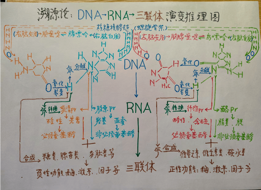 见 DNA演变成三连体流程图。从图中可以看到。 DNA的双螺旋结构。两条代表脱氧磷酸核糖的雌雄螺旋骨架[瓜蔓Wan],骨架是固质没有生命的,而蔓是有生命生物功能的。蔓不但可以输送营养,还能发出嘧啶与嘌呤。雄蔓[T、C两种脱氧磷酸核糖链组成],发出T胸腺嘧啶、C胞嘧啶。雌蔓[C、G两种脱氧磷酸核糖链组成],发出A腺嘌呤,G鸟嘌呤。并配对互补成 T--A.C--G。[资料显示。 DNA中的主要化学成分是氢和氮。不同结构的化学组合构成了。T、C、A、G。嘧啶和嘌呤。T、C、嘧啶溯源中枢定位是,左右大脑皮层灰质。特征是化学单一结构并携带氧。A、G嘌呤溯源中枢定位是,左右大脑灰质。特征是无氧的化学双结构。