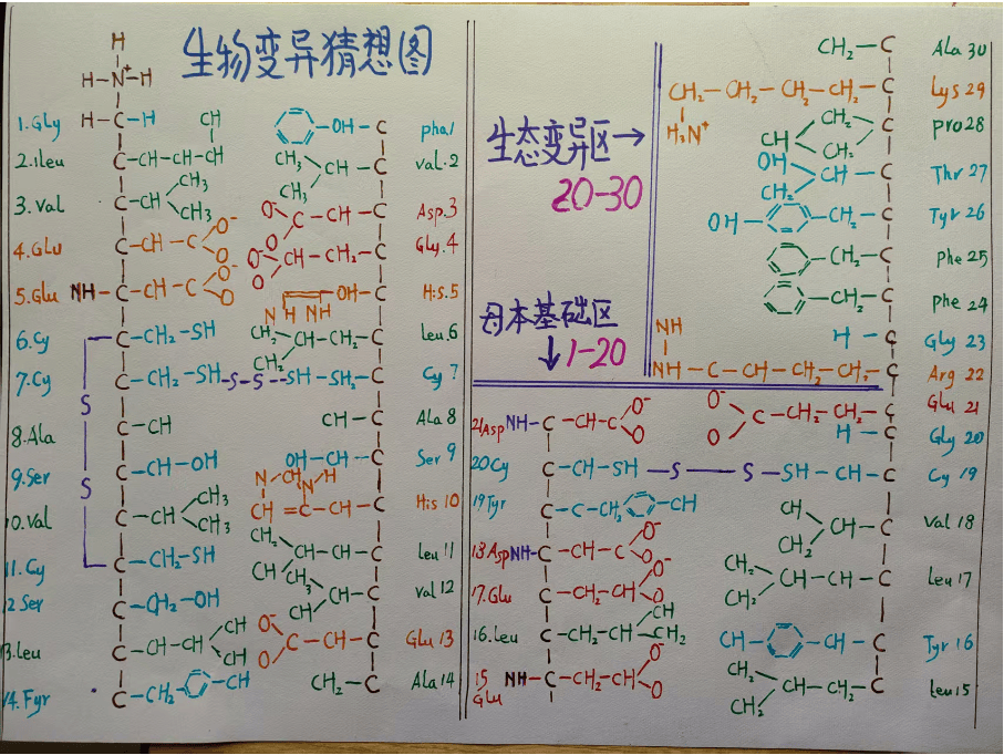 氨基酸展开图。对专业人士而言。就是小儿科。对非专业人群。可以增强对胰岛素为代表各种检验项目,的感知认知与理解。血糖的高低,是检验人体胰岛素代谢,重要检验指标。胰岛素是维持体内血糖正常代谢物质。间接反应胰岛细胞的功能。氨基酸顺序图。用4种颜色代表不同属性的氨基酸与大脑半球各部位功能。红色代表含酸性氨基酸,左大脑皮层灰质功能溯源。。。橙色代表含碱性氨基酸,右大脑皮层灰质功能溯源。。绿色代表含极性氨基酸,左大脑白质功能溯源。。蓝色代表。非含极性氨基酸,右大脑白质功能溯源。。不同性质的氨基酸。接受大脑中枢区域的神经支配。则一目了然。胰岛素有两条肽链。经二硫键连接构成主框架。由序排列不同属性的氨基酸,构成生理功能的生化物质[胰岛素、胰蛋白酶等],就是学术俗称基因的。螺旋骨架。 DNA. RNA.三联体。最后功能环节的三联体[各种酶.激素.因子]。众所周知,胰岛素的功能是降血糖。使血糖进入组织细胞。维持体内糖代谢平衡。资料信息提供。经过精准的化学分析,可以推算出。一分子蛋白质中,每一种氨基酸的总数目。但不能构成,独特氨基酸顺序排列,胰岛素与其他酶.激素等,由不同氨基酸的属性、数量、排列顺序,以构成以胰岛素代表为特征,梳理各种酶.激素等的核心因素。为了公正认识胰岛素类物质,根据现代学术有关,基因螺旋骨架DNA.RNA.三联体相关资料。重新溯源酶.激素.因子类物质生成与演变流程。胰岛素归属于三联体类物质。三联体类物质的胰岛素前身是RNA。RNA[核糖核酸]是DNA,演变成三联体[胰岛素]中间的工艺演变流程。,氧激活DNA[脱氧核糖核酸]A--T.G--C两对嘧啶和嘌呤组合中的氢,分解成氚氕氘。氚将DNA中的氮,蛋白。脂肪。氨基酸类分解成终极物质,氘.氕则将被分解的物质,重新合成胰岛素类三联体。