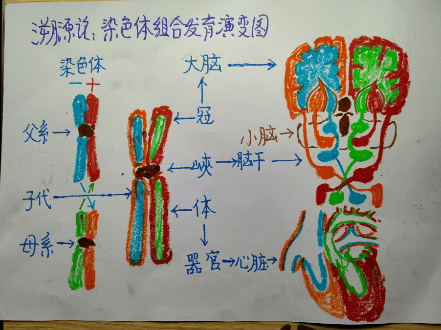 在人体发生繁衍过程中。人体由父系、母系各46对染色体组合而成。每对染色体由阴阳个体构成。它由冠、颈、体形态大小各异特征。这种特征决定该对染色体发育的器官的大小形态。发育演变成子代新生儿个体。这样子代新生儿。就拥有携带父系母系,所有历代祖先遗传基因。依据这个现代医学的理念。结合太极图阴阳学说。重新建立医学溯源论说。