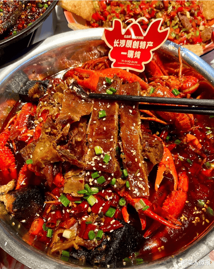 比如宁乡的餐饮人,加入当地特产兰花干子,吸饱汤汁后称这才是正宗的一锅炖;在星沙,餐厅卖龙虾的小伙子则加入了牛蛙,说这是“星沙一锅炖”;还有的在锅里加入方便面,主打一个“主食配菜一锅端”,让这道菜的形式愈发多元。