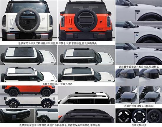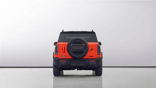 整体造型上,福特烈马新能源相比在售的燃油车型,车头部分经过了重新设计,配备了全新造型的头灯组,并且“BRONCO”标识能够点亮。发动机舱盖上还集成了贯穿式风道,搭配“烈焰橙”配色,黑色下包围搭配车身同色点缀,彰显出运动与时尚的气息。侧面采用悬浮式车顶设计,兼顾越野实用性。