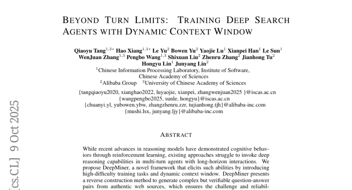这项由中国科学院软件研究所中文信息处理实验室的唐乔羽、向昊等研究人员联合阿里巴巴集团共同完成的重要研究发表于2025年,论文题目为《Beyond Turn Limits: Training Deep Search Agents with Dynamic Context Window》。感兴趣的读者可以通过arXiv:2510.08276v1查询完整论文。