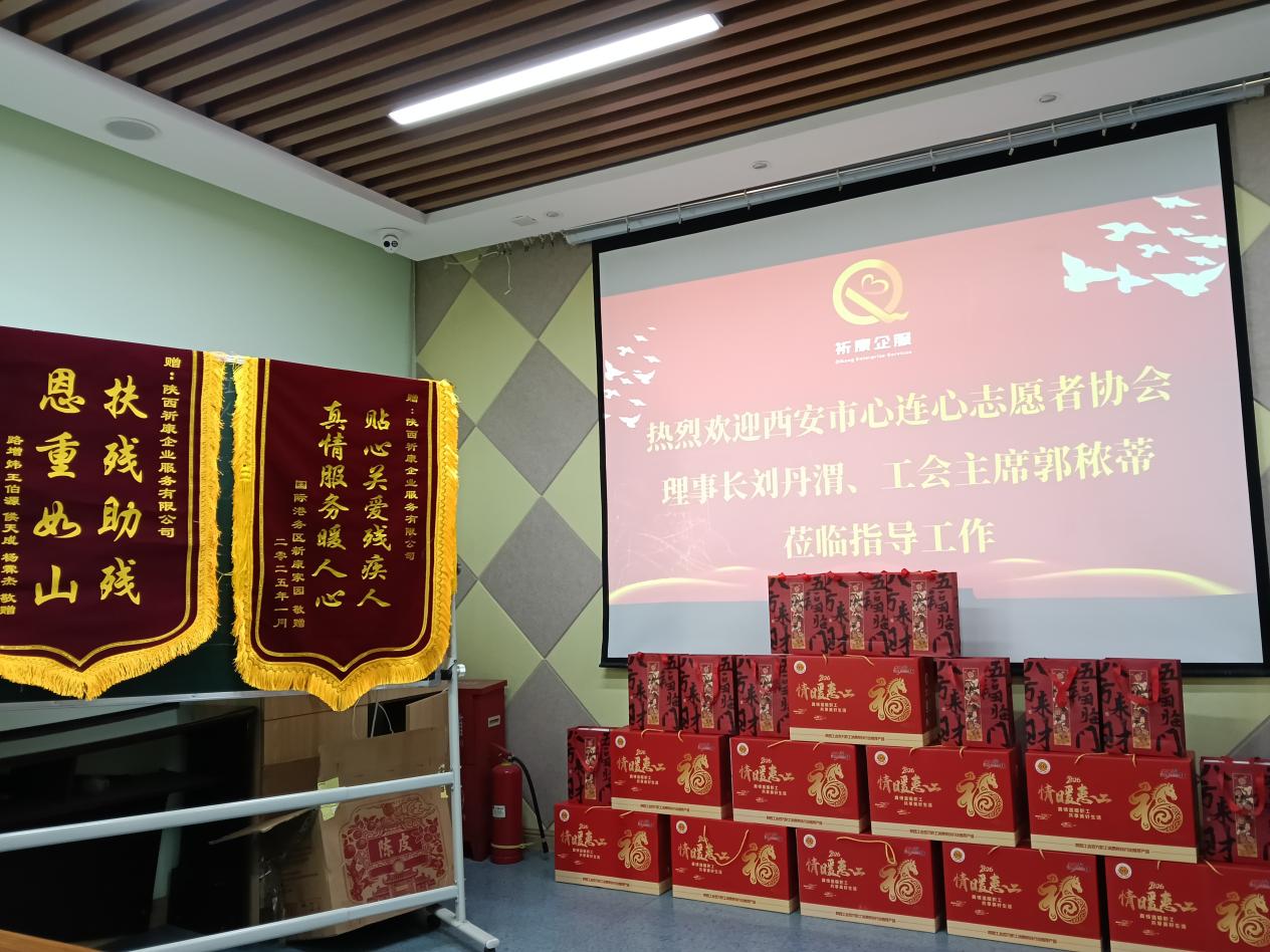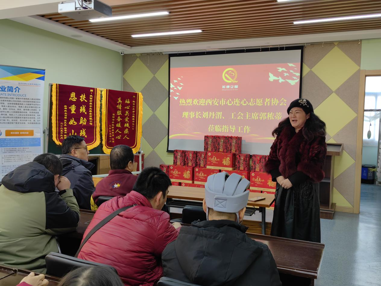 2026年2月9日上午,西安市心连心志愿者协会理事长刘丹渭、工会主席郭秾蒂一行来到祈康社区残疾人实训基地,慰问基地残疾职工,与残疾职工代表面对面交流,传递社会对残疾人士的关怀与尊重。