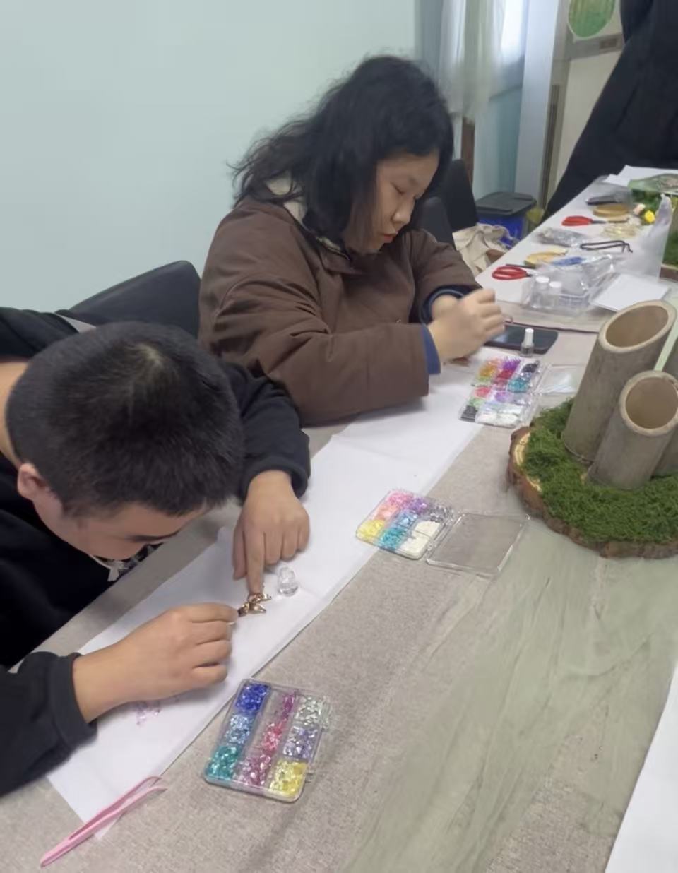随后,基地职工丁欢、杨霖杰现场展示所学的螺钿技艺,刘理事长、郭主席与员工们围坐在一起,认真观看两位职工制作螺钿装饰品,并为残疾人士在未来发展方向上提出积极有效的建议。