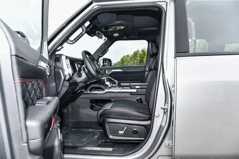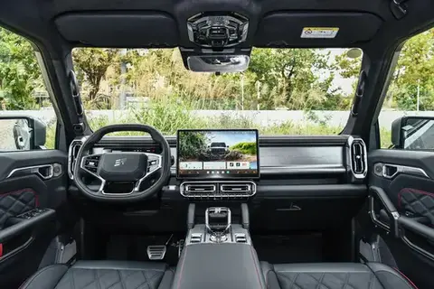 车内多处采用软质搪塑材料包覆,搭配哑光金属饰条与钢琴烤漆面板,立柱拉手等细节处融入镭雕纹路与防滑橡胶垫,既强化了越野场景的握持感,又通过精致工艺提升了整体质感。智能座舱方面,车辆搭载基于高通8155芯片的TOUR OS 3.0系统,界面采用扁平化设计,层级精简至3步内即可完成核心功能操作,大幅降低学习成本。集成科大讯飞星火智能AI大模型的语音助手支持四音区独立识别,可精准响应主副驾及后排乘客指令,实现对空调温度、车窗开合、座椅通风等功能的语音控制。车机生态方面,内置腾讯视频、酷狗音乐、喜马拉雅等16款主流应用,覆盖视频、音频、导航等全场景需求,配合5G网络模块,确保用户实时获取在线资源,打造沉浸式智能出行体验。