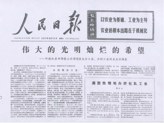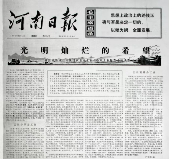 河南日报总编辑刘问世接到批示后,次日便带领编辑部的刘旭、姬业成、毕景娴、张世勋、周淑丽等人赶赴回郭镇,在杜贵宝、牛玉乾的陪同下,再次深入基层座谈采访、核实情况。当天返回报社后,刘问世总编指派农业处的姬业成汇总众人意见,执笔对原稿进行再次编辑调整,最终由他亲自审定。曾参加 1959 年中央第二次郑州会议的刘问世,亲耳聆听过毛主席关于 “人民公社办工业,这是我们伟大的光明灿烂的希望所在” 的重要论述。他再次翻阅当年珍贵的会议纪要,大笔一挥为文章定题 ——《光明灿烂的希望 —— 巩县回郭镇公社围绕农业办工业、办好工业促农业的调查》,并于 1974 年 12 月 15 日在《河南日报》一版以配图通栏的形式发表。