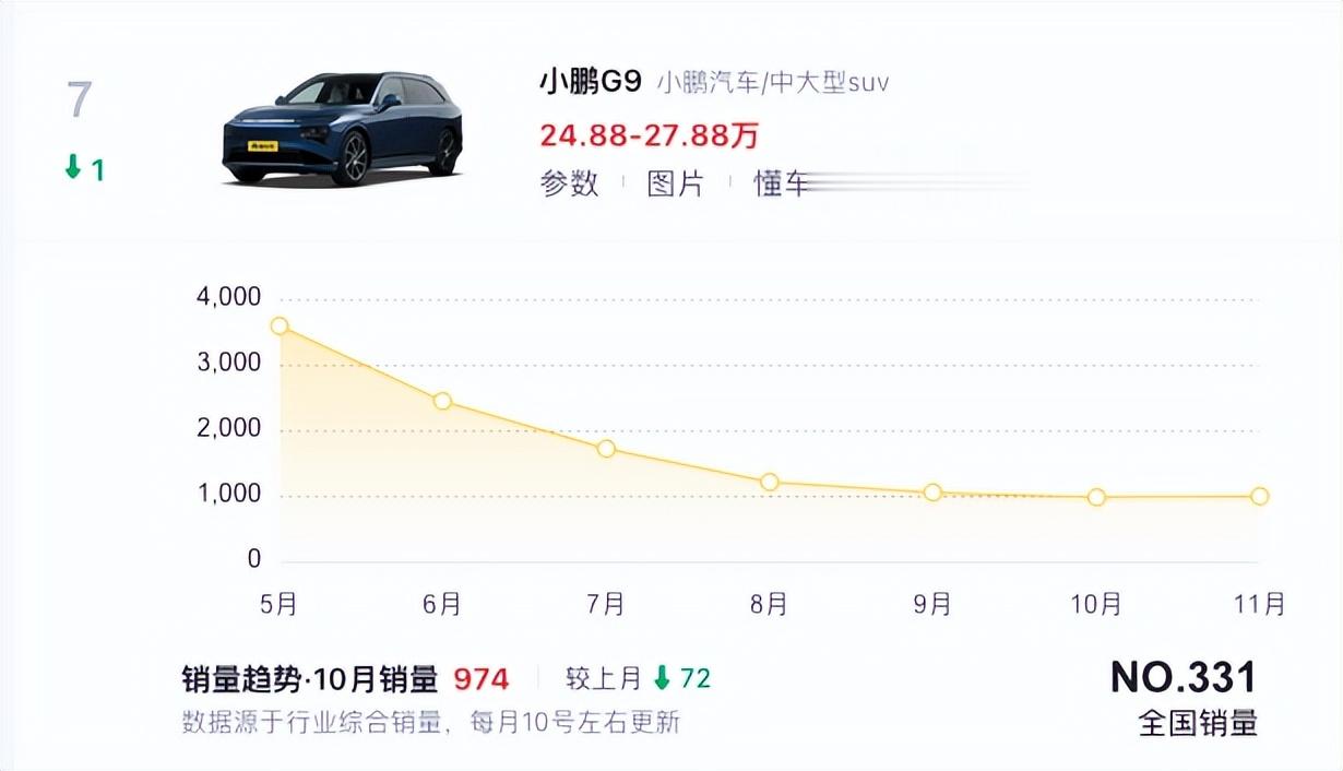与小鹏P7一样陷入销量困境的还有小鹏G9,作为家族一款旗舰级的中大型纯电SUV,小鹏G9目前陷入了“平庸”的困境,整车自2022年上市之初就因复杂的配置和定价策略遭遇口碑危机,为其后续发展蒙上阴影。