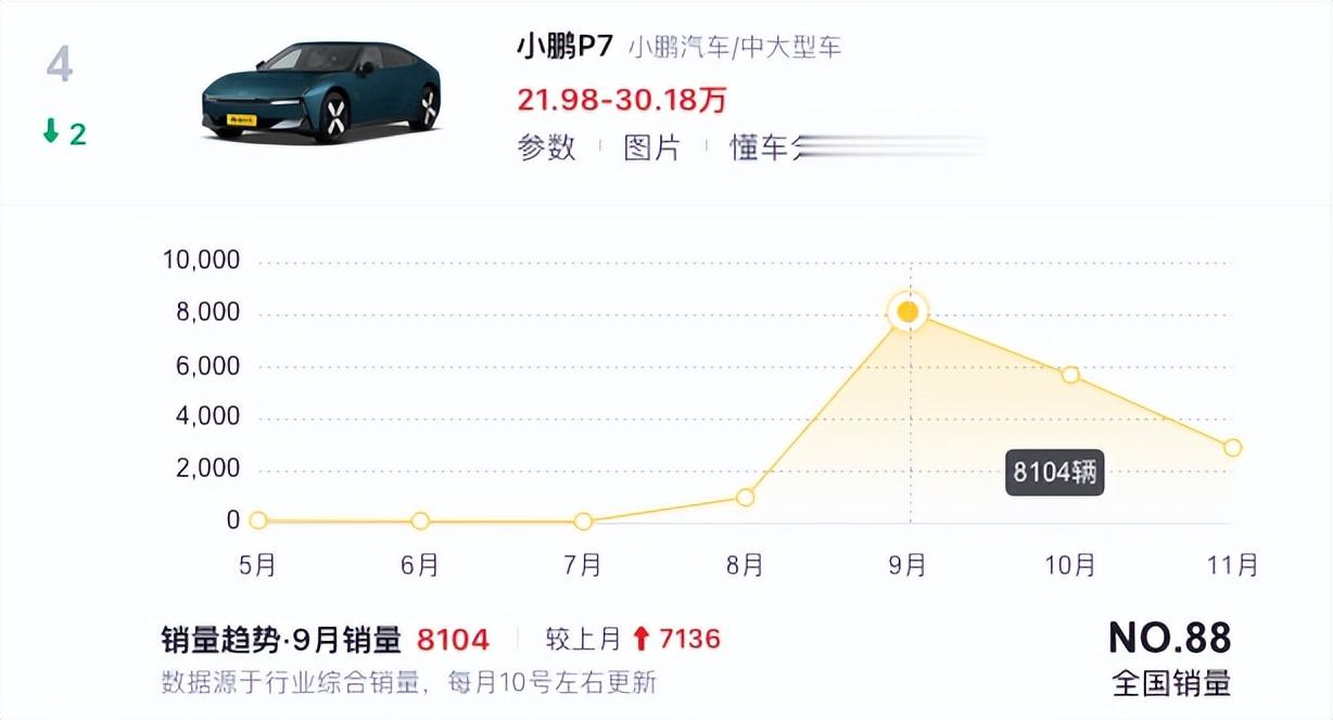 根据数据显示,全新小鹏P7的销量从2025年9月的8110辆骤降至10月的5662辆,而在11月整车销量仅2902辆,短短两月内跌幅超过六成。