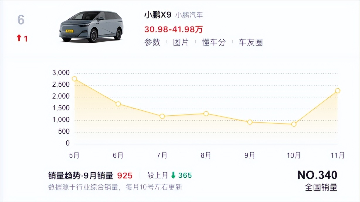 小鹏X9作为小鹏在MPV车型领域的重要车型,虽然在11月销量出现了明显反弹,但从5月份的高点持续下滑近半年,值得注意的是,虽然2025年5月小鹏X9的销量达到2767辆,但这一数字仅为同期混动MPV冠军腾势D9销量的约三分之一,同样未达到小鹏的预期。
