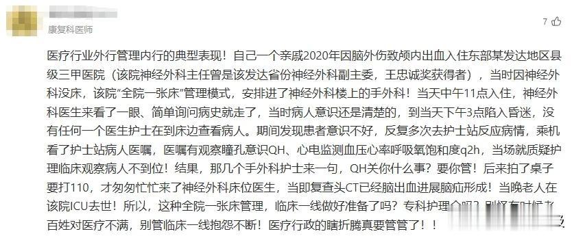 李大爷是幸运的,可另一位脑外伤患者的遭遇,像一盆冷水浇在改革的热火上。网友发帖回忆:父亲因脑外伤致颅内出血,神经外科满床后被转到手外科。当晚11点,老人突然昏迷,手外科护士按常规巡视,没注意到颅内压异常;等神经外科医生接到会诊赶来,CT显示已脑疝,老人当晚离世。