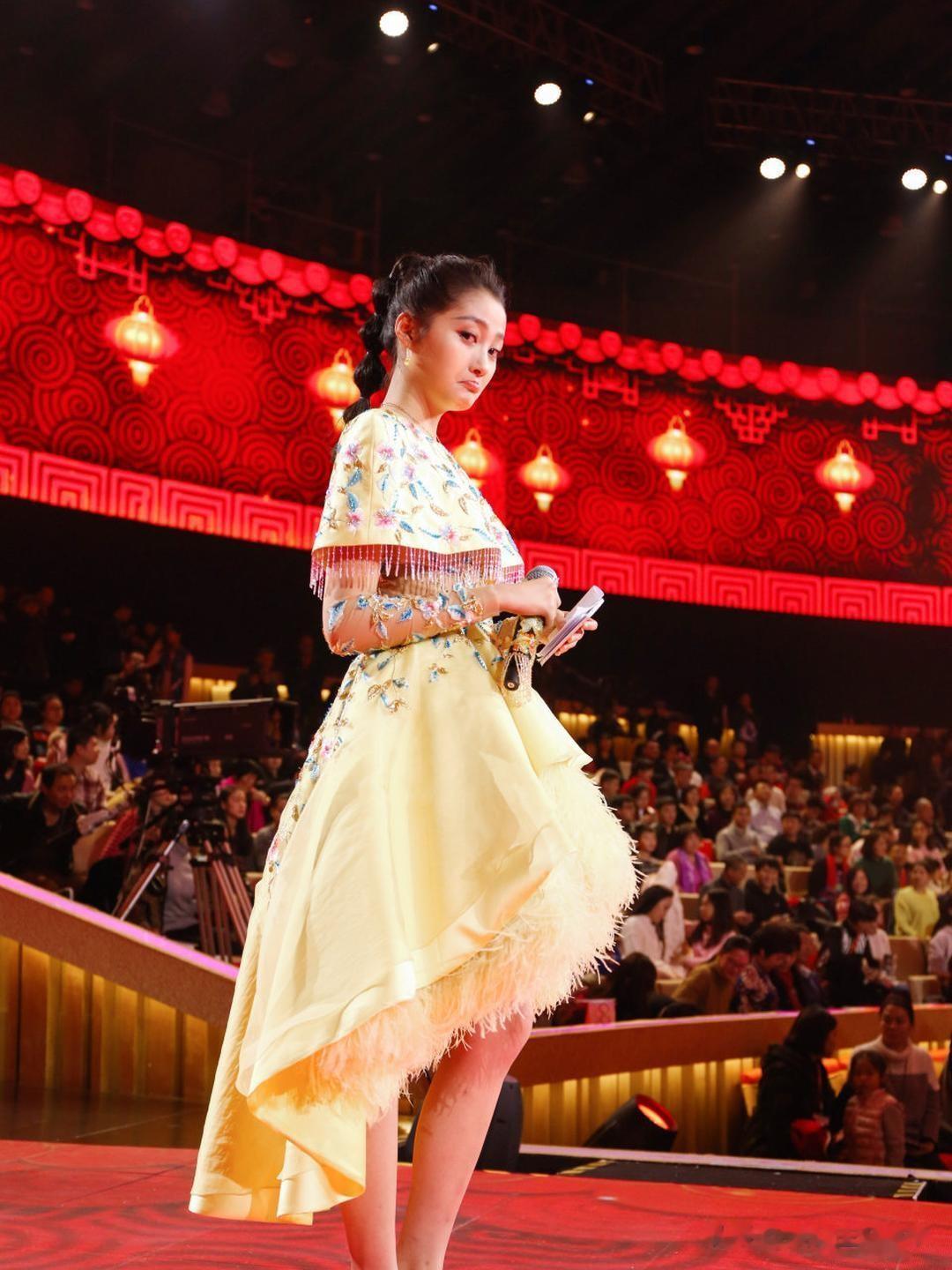 关晓彤,高扎发髻米色裙子水晶高跟鞋,甜美可爱。
