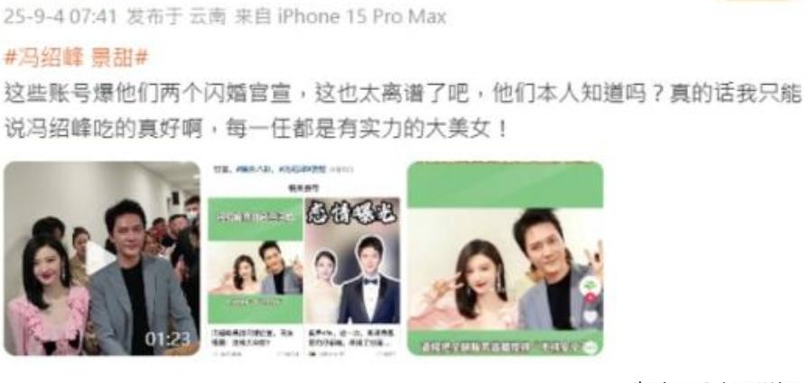 景甜前几天在微博发了“假!!!”直接怼上冯绍峰的未婚传闻。两人压根八竿子打不着,这瓜传得够呛。冯绍峰这人绯闻多了去了,从赵丽颖到倪妮,现在又掺和进景甜。