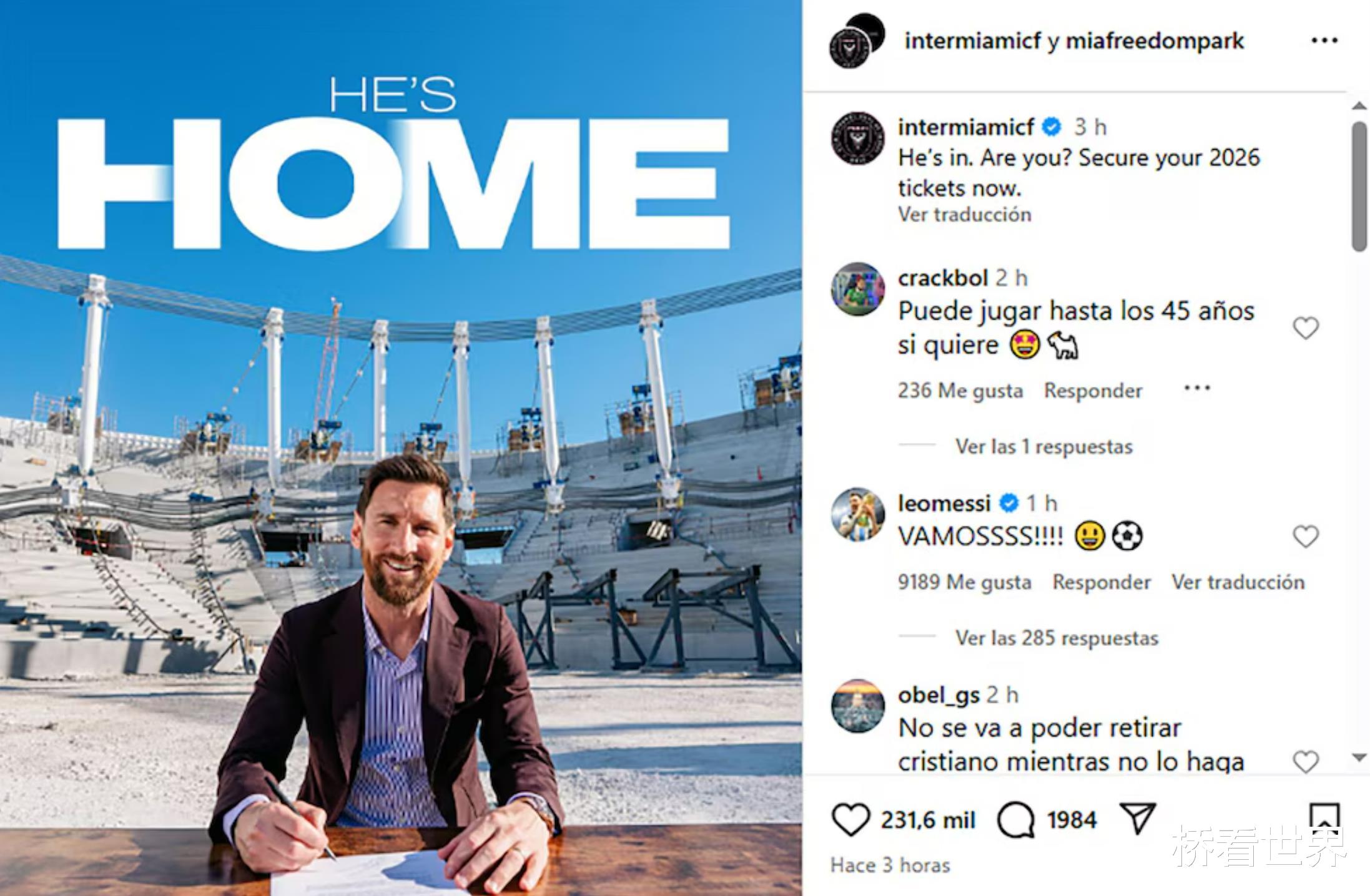 续约消息公布后,梅西在俱乐部社交媒体上写道:“冲啊!!!”,这条评论附在标题为 “他的家”(he´s home)的帖子下。
