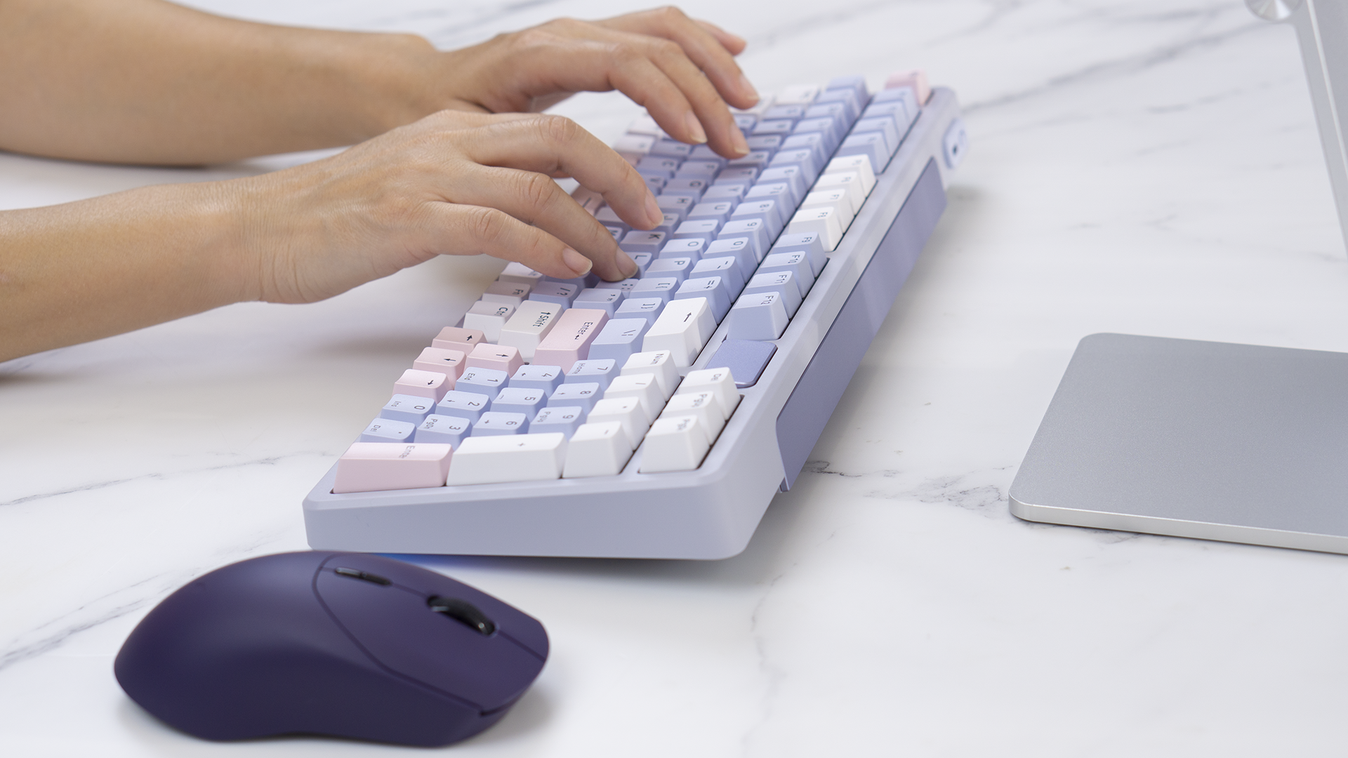 雷柏V700DIY-98 长续航版为白色+莫奈粉+莫奈蓝的颜色,这种低饱和度的配色,也非常对我们的胃口。至少,它在用起来的时候,没有深色键盘的压抑,也没有多彩键盘的随意,有那么一种很仙气飘飘的感觉。