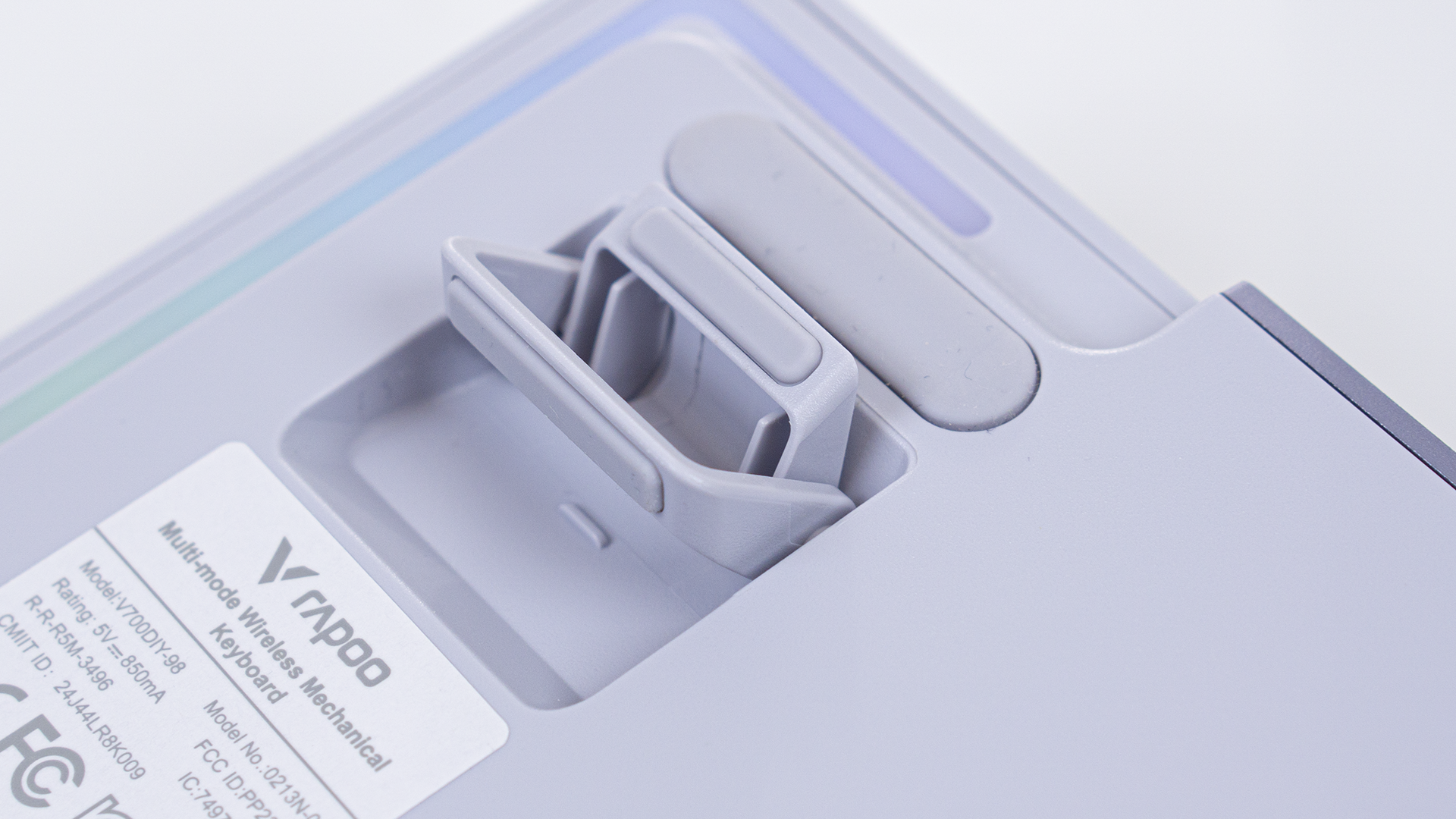 从RGB灯光效果上来看,除了按键下的灯光外,它在键盘的底部、2.4G接收器收纳仓处,单独设有灯条。其中,收纳仓位置的,官方叫做“幻境时空仓”:,还兼顾电量显示。另外,雷柏V700DIY-98长续航版还支持蓝牙5.0、有线及2.4G连接。