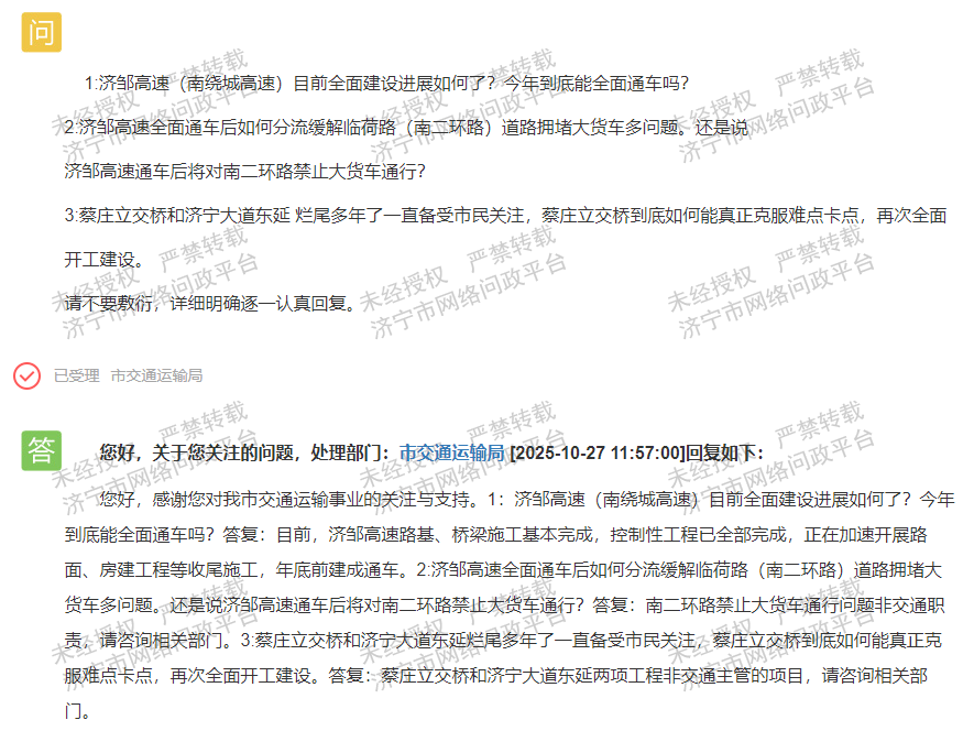 该网友询问,济邹高速(南绕城高速)目前全面建设进展如何?今年能否实现全面通车?同时,网友关注济邹高速全面通车后,将如何分流缓解临荷路(南二环路)因大货车多而造成的道路拥堵问题,是否会对南二环路禁止大货车通行?此外,蔡庄立交桥和济宁大道东延工程烂尾多年,一直备受市民关注,蔡庄立交桥究竟如何克服难点卡点,实现再次全面开工建设?