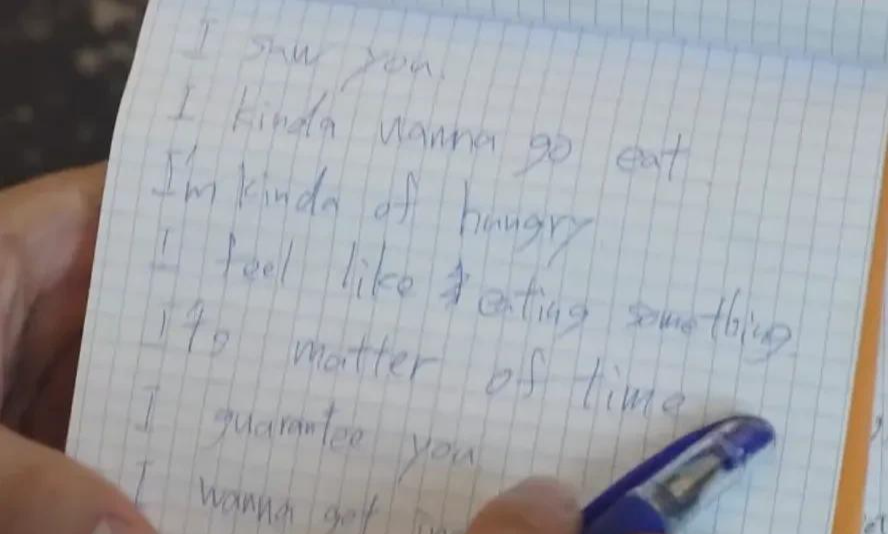 原来,河村会随身携带小笔记本,随手记录一些日常的英语表达。他还会随身带着语法书,利用吃饭的时间,学习语法知识。当他知道自己要接受采访时,还会提前用英语打好草稿。和我们刚学英语时一样,他也用母语,对不熟悉的单词注音。如果采访时,河村长时间卡壳,灰熊队的老大莫兰特,还会守在旁边帮他回答。